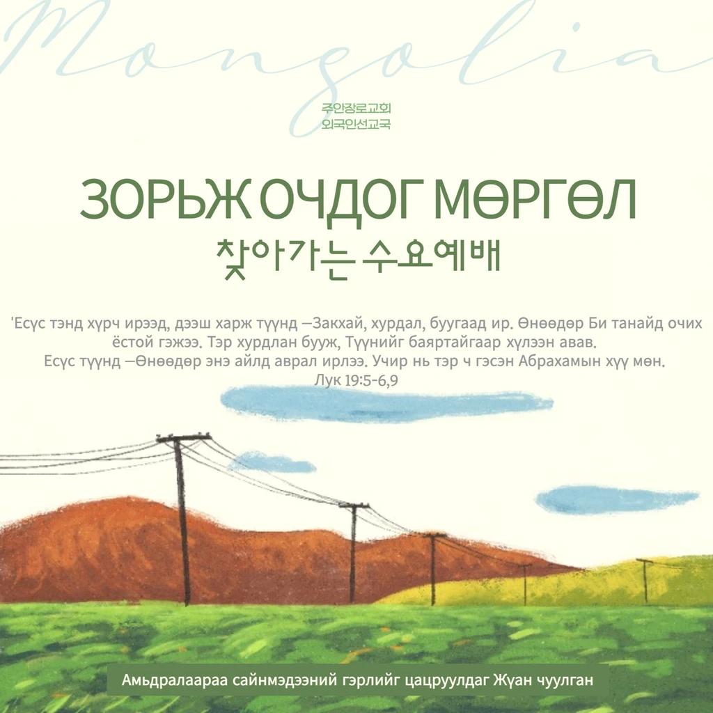 Зорьж Очдог Мөргөл 찾아가는 수요예배 2026-1-7 өдөр орой 19:30 цагт Алтанцоож ахлагч, Батчимэг нарын гэрт цуглаад хамтдаа мөргөл өргөнө. Холбогдох утас: 010-8440-6623 Байршил: Инчеон хот, 1-р шугам, Жагжон-ёг буудал / 작전역 , 7-р гарц Хаяг: 인천광역시 계양구 길마로78번길 3 Та хүсвэл таны байгаа газарт бид зорьж очоод хамтдаа мөргөл өргөхөд бэлэн байна. Алтанцоож ахлагч 010-8440-6623 'Учир нь хоёр буюу гурвуулаа Миний нэрээр хаана цуглана, тэнд Би тэдний дунд байна гэж айлдав. ' Матай 18:20